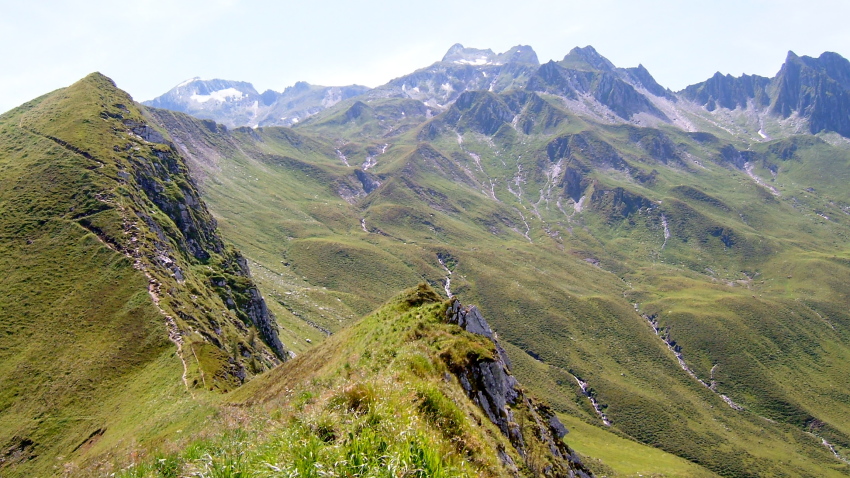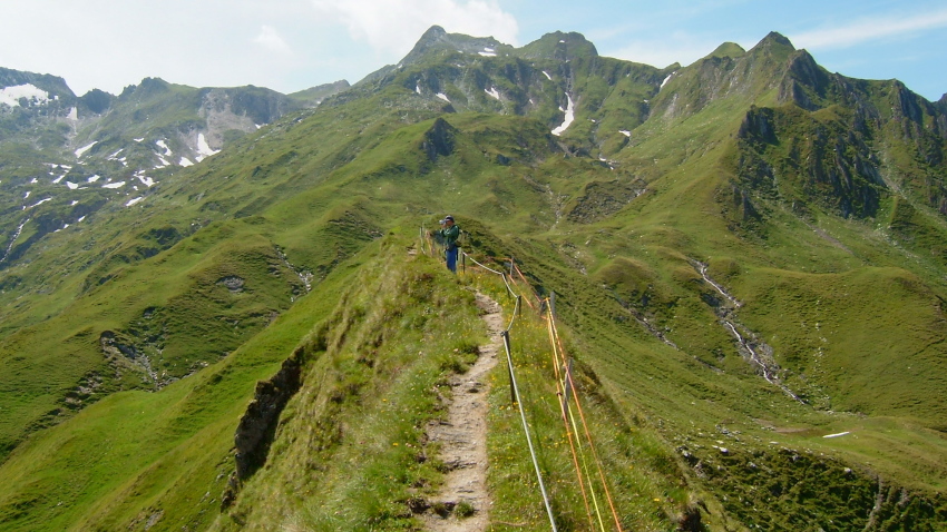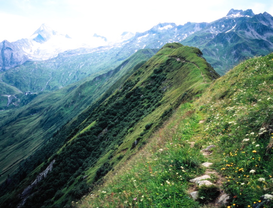 今回のトレッキング・コースは、U字谷の山腹をトラバースして麓近くのヒュッテまで行くコースです。距離も長く、痩せ尾根を通過するなどスリルも有りますが、氷河をまとったキッツシュタインホルンを眺めながらの稜線歩きはまるでスカイラインのウオーキングのようです。