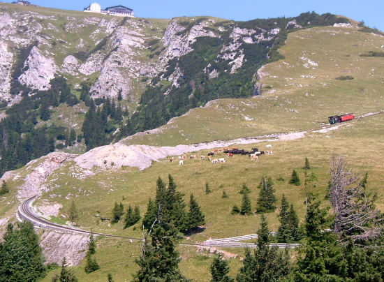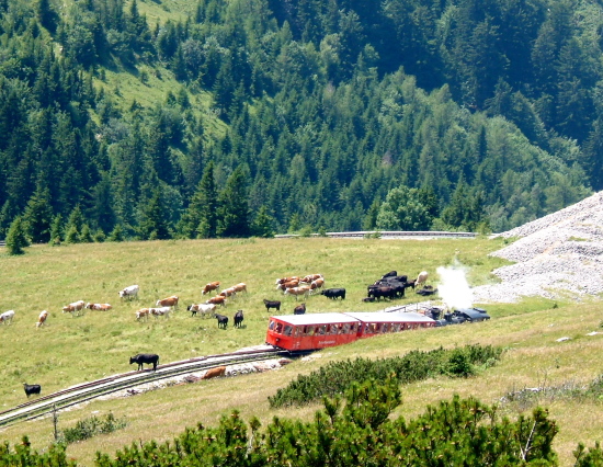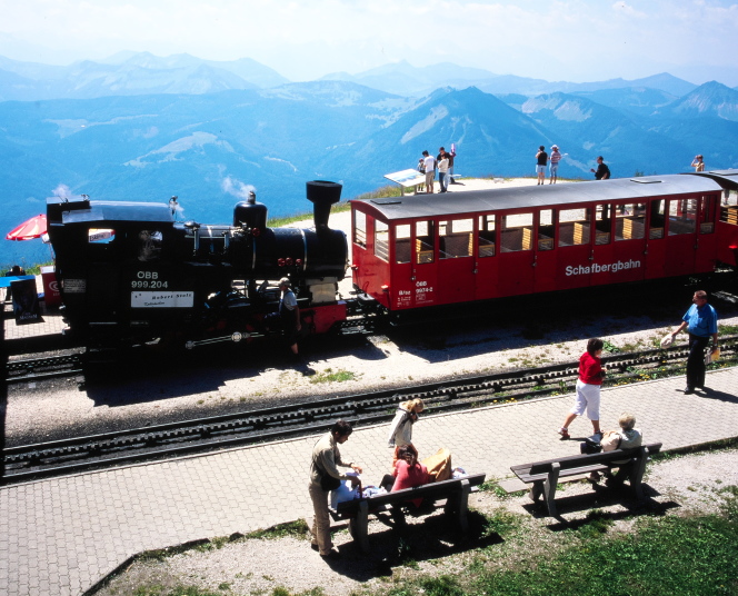 シャーフベルクSchafberg(1782m)へは、「サウンド・オブ・ミュジック」にも出てくる蒸気機関車で山の上へ行きます。途中、線路上で牛の群れに出会いましたが、牛が移動するまで列車はしばらくの間止まりました。牛が優先の土地柄のようです。