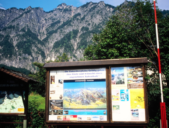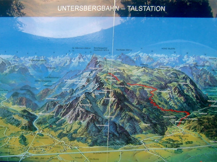 ウンテルスベルクには、ザルツブルグよりバスでサンクト・レオンハルトSt.Leonhard(456m)に行きます。ここからウンテルスベルグバーンUntersbergbahnに乗り山頂駅に着きます。ここから十字架の立つ展望台(1805m)まで登ってゆきます。この展望台から更に登ってゆくとザルツブルガー・ホッホスロンSalzburger Hochthron(1853m)の頂上です。ここから1時間下って行くとアイスヘーレEishohleの洞窟が有ります。そしてウンテルスベルク山塊を巻き込む様に降りてゆくとシュエレンベルガー・アイスヘーレヒュッテSchbg.EishohlenH(トニーレンツヒュッテToni LenzH)が有ります。そこから谷沿いに麓の村へ降りると、行きに下りたサンクト・レオンハルトSt.Leonhard(456m)の延長線上の道路に出ます。ここでバスでザルツブルグへ帰ります。