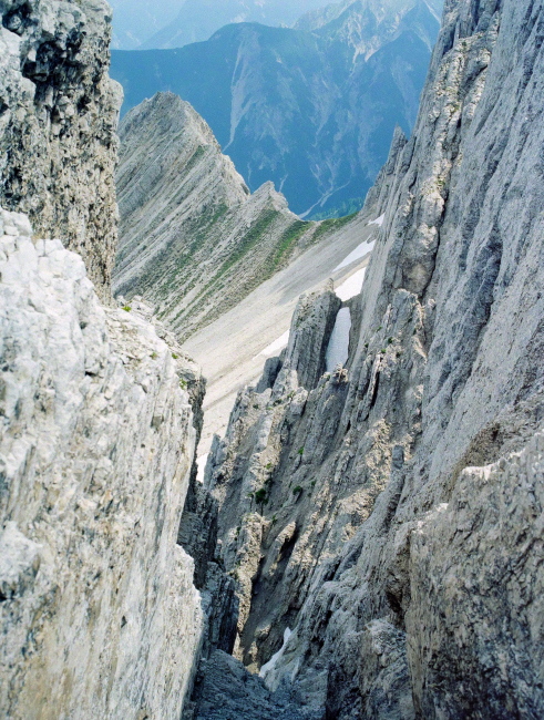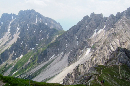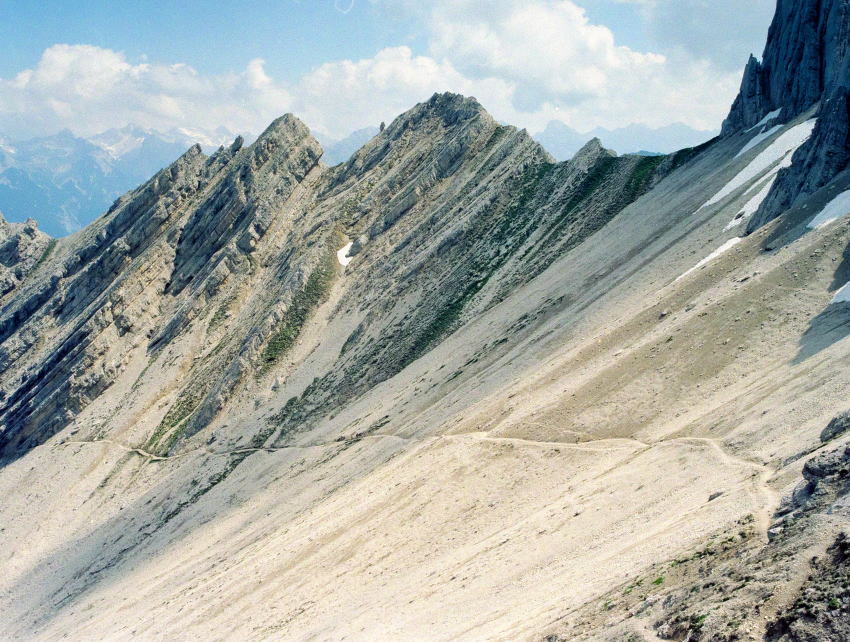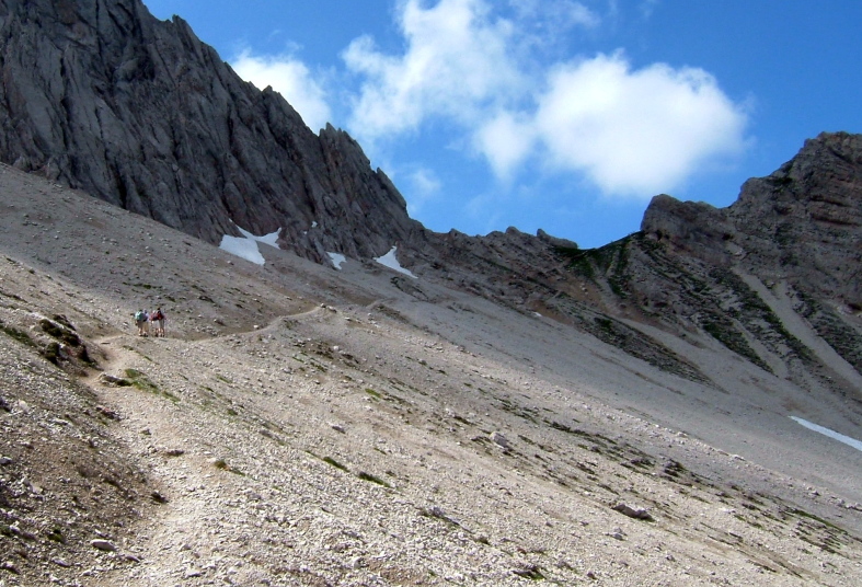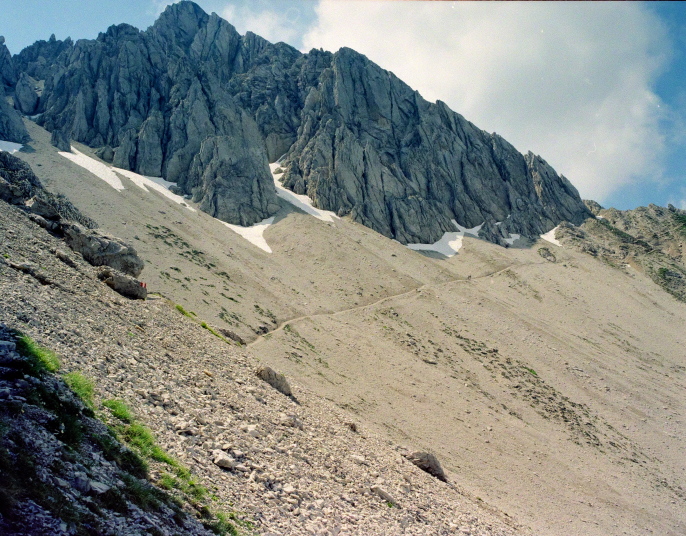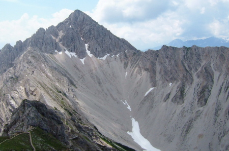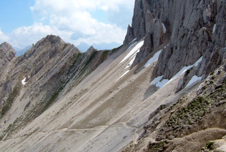 途中鞍部があり、そこから二又にルートが分かれます。右に進路をとると岩稜と砂の混じった急斜面をトラバースし、ゼーフェルダーシュピッツェSeefelderSpitze(2221m)に行きます。左に進路をとると、もと来たヘルメレコプフHarmelekopf(2050m)です。