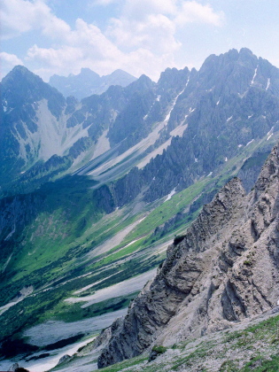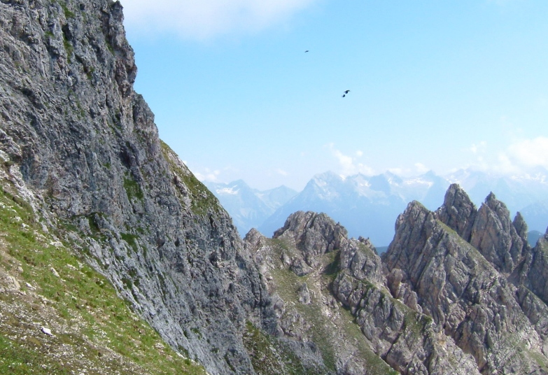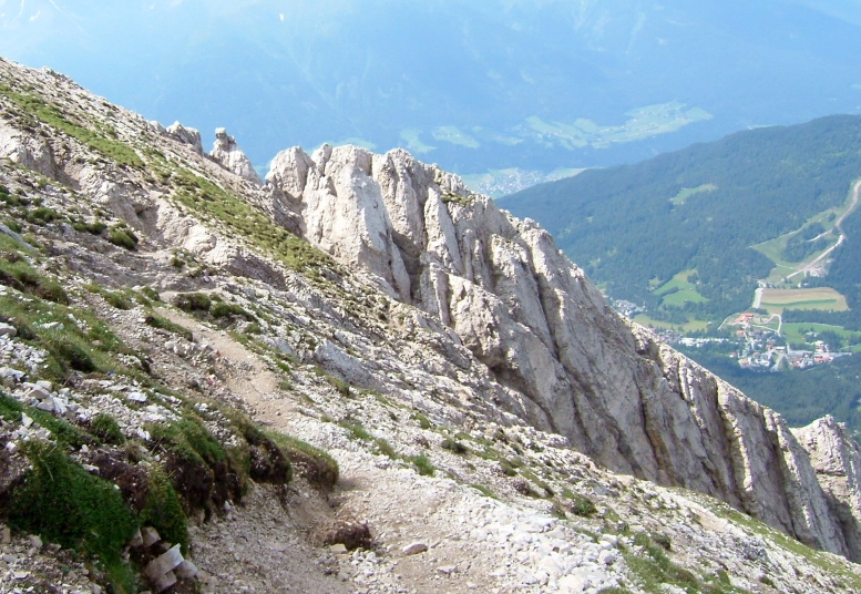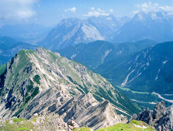 また、南のほうに目をやると、イン川を隔てて遠くにシュトゥーバイタールの山々が見えます。眼前には南から西へカルヴェンデルKarwendelの岩稜が圧倒的な迫力で迫って見えます。
