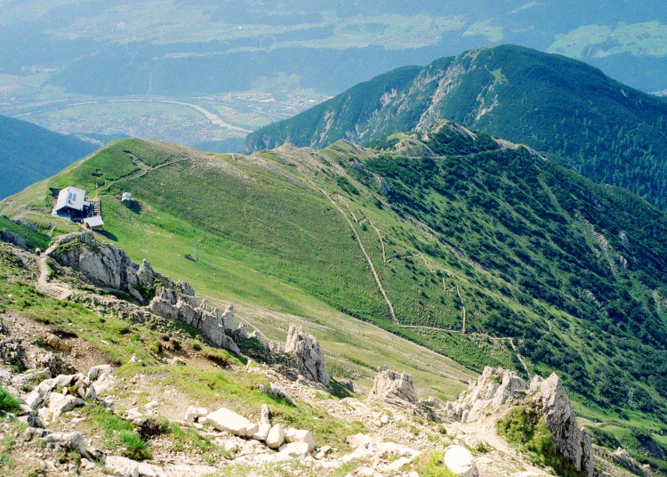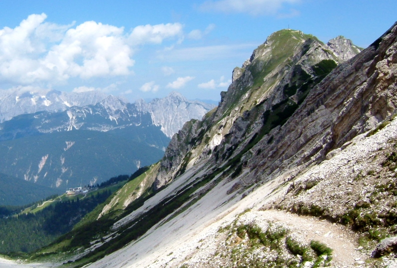 コースは、展望台までケーブルカーとゴンドラリフトで登ります。ケーブルカーの終点駅ロスヒュッテRosshutte(1751m)より、ゴンドラリフトで右尾根に有るヘルメレコプフHarmelekopf(2050m)に向かいます。ヘルメレコプフHarmelekopf(2050m)展望台の眺望を楽しんだらライターシュピッツェReitherspitze(2374m)の山頂を右側から巻きながら登ってゆくとネルトゥリンガーヒュッテNordlinger Hutte(2239m)に到着です。