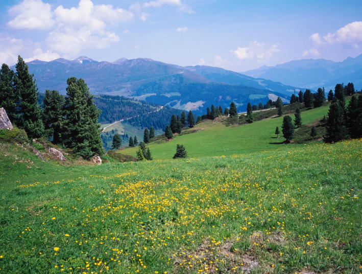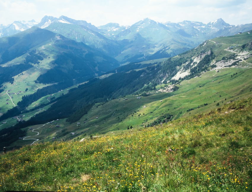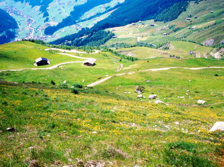 このコースは、眼下にフォーデルラナースバッハの村を見て、牛たちがのどかにアルプの牧草を食べている光景を眺めながら高原を下って行く、のんびりとした気分の味わえる山歩きのコースです。