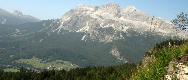 後ろを振り返るとコルティナ・ダンペッツオの街越しにトファーナTofana(3244m) ファローリアFaloria (2331m)がパノラマのように広がって見えます。 |