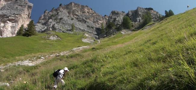 ここから山頂へ向け、「ヴィア・フェツラータ」と呼ばれる鉄のロープや梯子を使いながら岩肌を進む、難易度の高いコースに挑戦している人がいます。 |