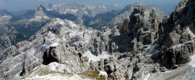 鞍部でしばらく休憩です。眼の前には、クリスタッロCristaallo(3221m)の山塊が荒々しい岩肌をむき出しています。 |