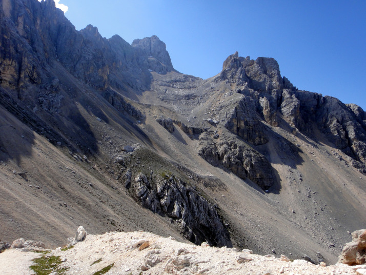 垂直の岩場とザレ場の境のルートを歩いて行きます。 |