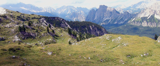 フォローリア小屋Rifugio Faloria(2123m)フォローリア小屋周辺は、草付きとなっていますが、草付きが広がる西側(手前方向)は、徐々に傾斜が強くなっています。 |
