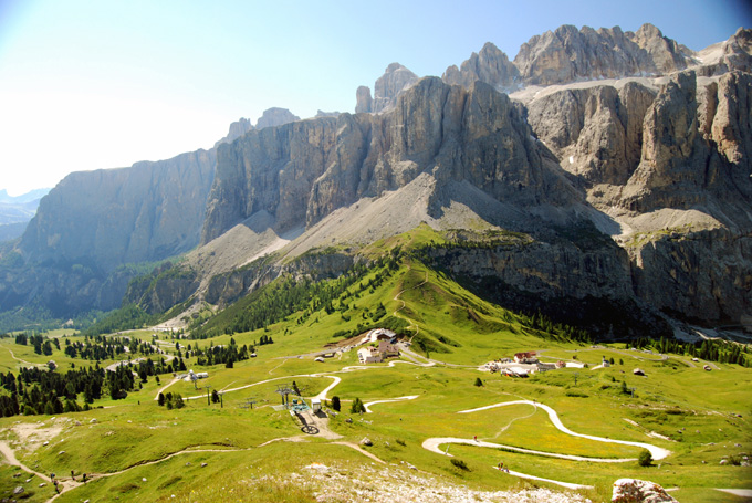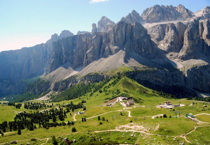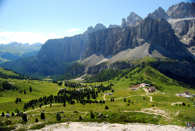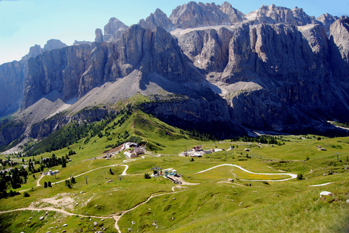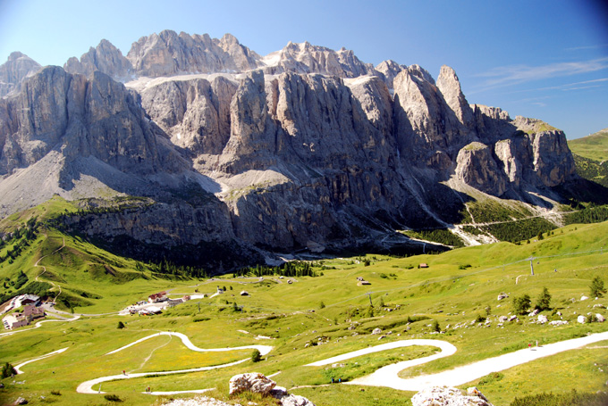 ガルデナ峠越しに巨大な山塊が目の前に壁のように立ちはだかって見えます。セッラ・グループSELLAGRUPPEです。