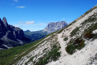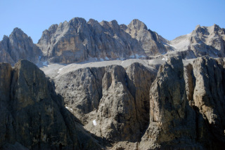 南西方向にはサッソ・ルンゴ SASSOLUNGO 3181mが見えます。ここから見るサッソ・ルンゴ SASSOLUNGO 3181mは台形の形をして見えます。セッラ峠Passo Sella 2244mより見たサッソ・ルンゴ SASSOLUNGO 3181mとは、まったく違った山容です。同じ山容とは思えない程です。