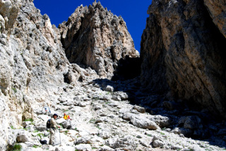 少し上部の方に登って行くと、直ぐに切り立った岩稜が行く手を阻みます。針のような岩稜が乱立しています。岩壁の間に通じる細い急坂を更に登ってゆくと、大きな壁に突き当たります。それ以上は、ロッククライミングの世界になってしまいます。