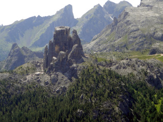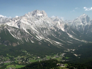 フォローリアFALORIA(2331m)後方はソラピス(Punta Sorapis 3205m)の山塊、右側にアンテラオ(Monte Antelao 3263m)が見えます。眼下は、コルティナ・ダンペッツオの街。 |