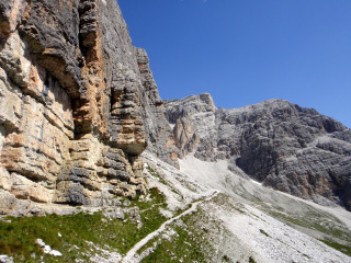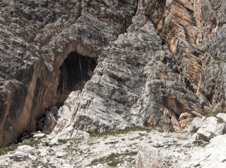 第一次世界大戦時、イタリア軍とオーストリアの山岳兵が戦った塹壕が岩壁に残っています。塹壕には、谷越しに相手側の陣営を見る為に、断崖の岸壁を削った窓が有ります、 |
