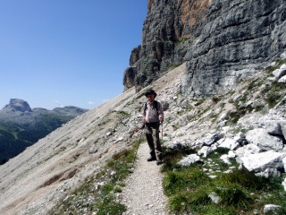 中央山道の先、右にアヴェラーウ山(AVERAU 2649m)。左の尖塔はチンクエトッリ(Cinque Torri) |
