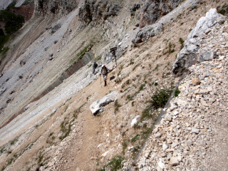 ザレ斜面の勾配が急になり、トレールも細くなるスリリングな場所があります。細いトレールで、珍しくトレッカーに出会いました。お互い譲りながらこのスリリングな場所を通過します。