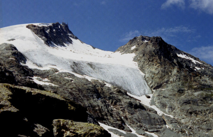 左の三角の影になっている山はPiz Tschierva(3546m)