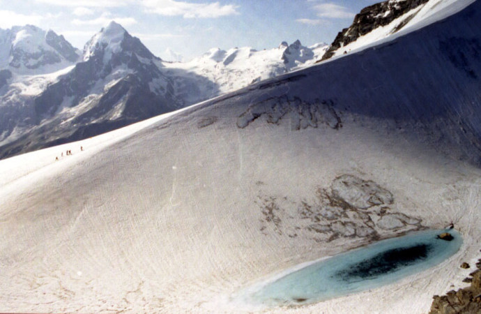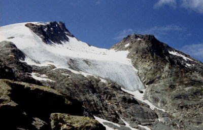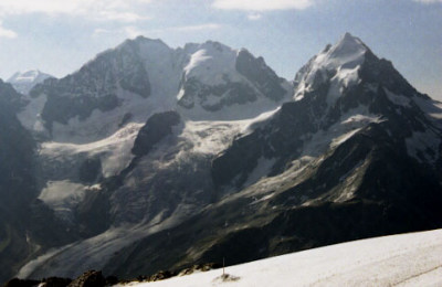 右の氷河は、ロゼック氷河(Vadret da Roseg 3920m)と呼ばれておりこの氷河は、これからトレッキングするロゼック谷に流れ、ポント・レジーナ(Pontresina)に至ります。 |