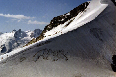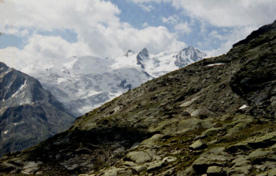 ガレ場をトラバースし、一登りすると急に眺望が開け、ロゼック谷を隔てベルニナ山群が忽然と姿を現わします。ベルニナ山群の核心部が見えて来ます。