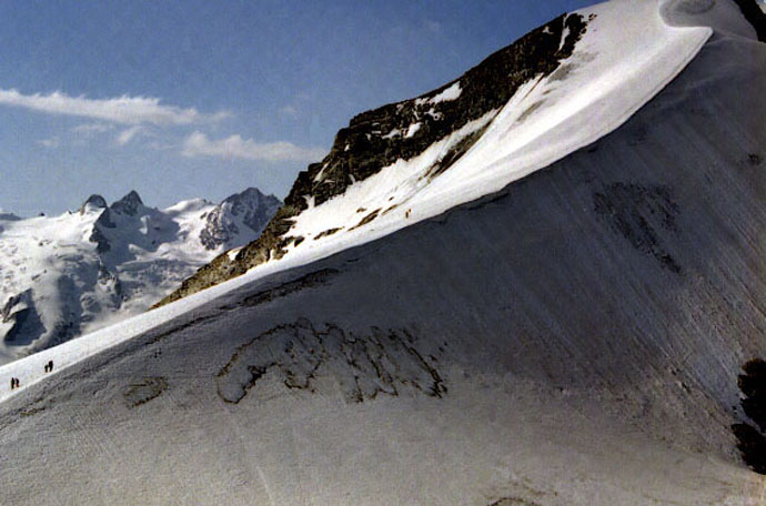 右から三角錐の山がピッツ・ロゼックその隣後方に、ピツツ・シエルセン(Piz.Scerscen3895m)そしてピッツ・ベルニナ(P.Bernina)(4049m)と続きます。