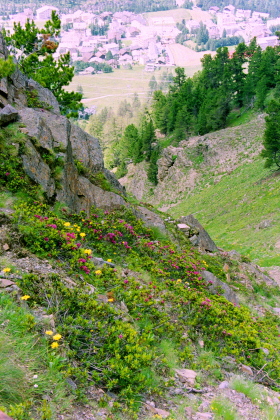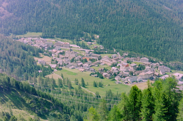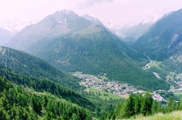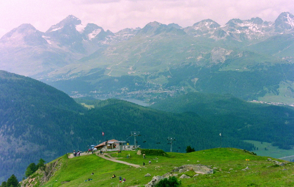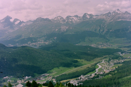 ポントレジーナ(Pontresina)の村越しに、ロゼック谷を正面眼下に見渡せます。