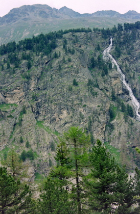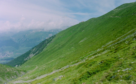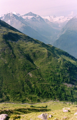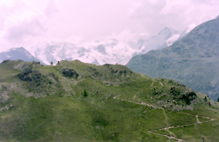 セガンティーニ・ヒュッテを過ぎ、ポントレジーナ(Pontresina)の村外れ迄山腹を巻いて行きます。 |