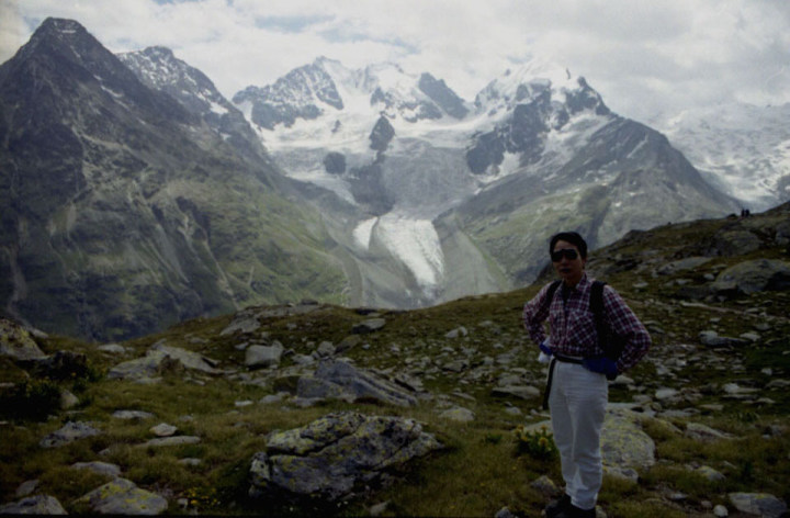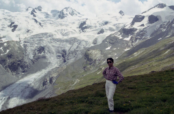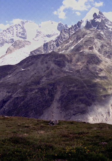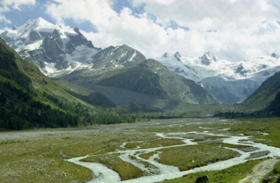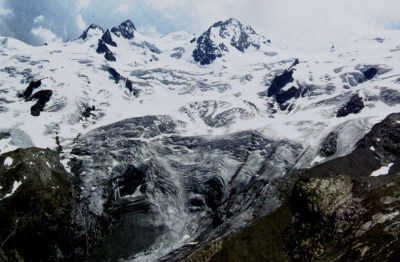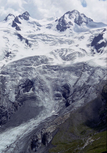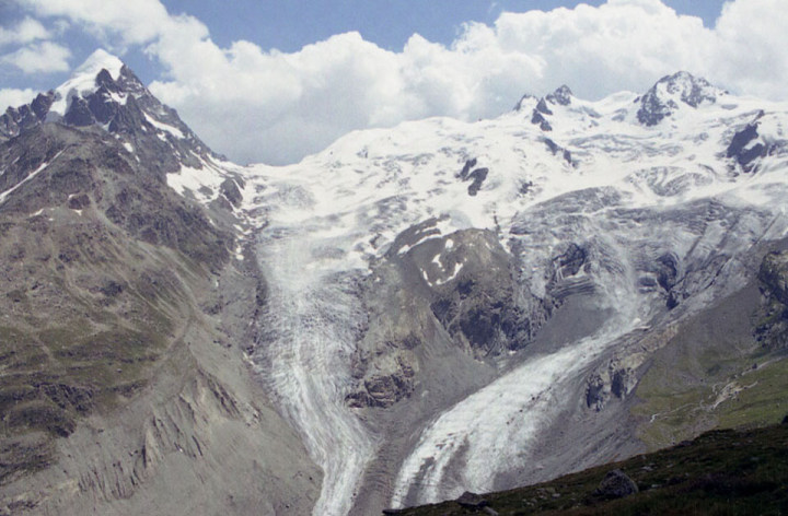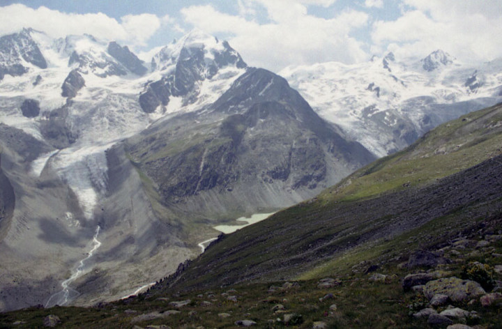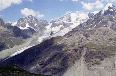 Roseg 3,937m)。流れ出すチエルヴァ氷河。