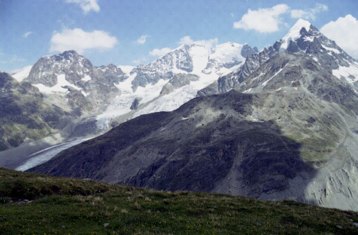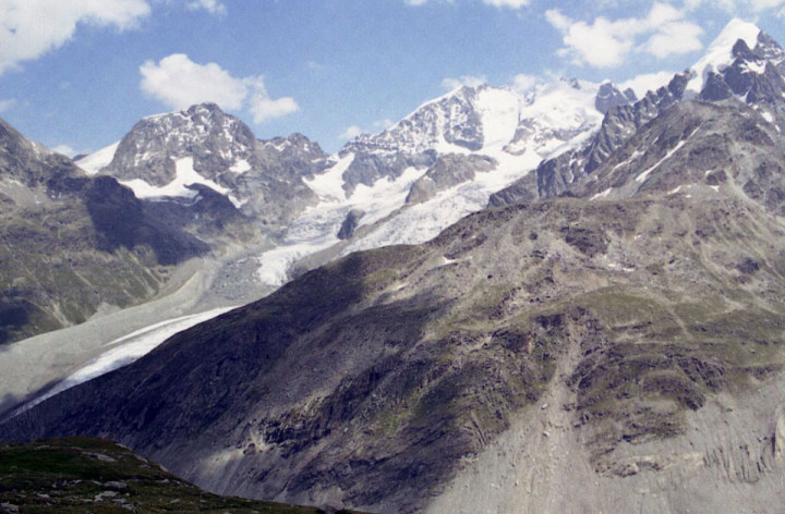 左よりピッツ・ベルニナ(Piz Bernnina 4,049m)、 ピッツ・シエルシエン(Piz Scerscen 3,937m)、右の三角錐の山がピッツ・ロゼック(Piz
