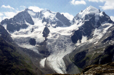3,937m)、ピッツ・ロゼック(Piz Roseg 3,937m)、(この三山をベルニナ三山と呼ぶそうです)の間より流れ出る氷河チエルヴァ氷河(Vadret