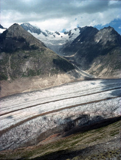 ユングフラウ・ヨッホより見るアレッチ氷河は、定番の景色ですが、実はアレッチ氷河の一部、上流部しか見ていません。